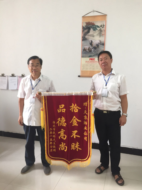 次日,向管理處送來鮮紅的錦旗一面,上書:拾金不昧,品德高尚!