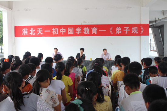 天一初中負責人郭光梅給學生講授《弟子規》,對學生文明禮儀、傳統美德、行為習慣、校規校紀進行了品德教育。天一初中一直把傳統教育和新形勢下教育理念相結合,在七年級新生即將進入中學階段學習之際,天一初中狠抓國學教育不放松,打好學生良好美德底色。淮北市天一初中是淮北市孝文化研究會實驗基地,一直以來,該校將對師生進行的《弟子規》《新24孝》教育與創建文明校園、精致校園緊密結合,取得了顯著成效。該校大力開展孝文化國學教育主題教育宣傳實踐活動,營造濃厚的孝老愛親文化氛圍。在校領導班子中,把孝老愛老作為加強自身建設的重要內容和行為準則,要做孝老愛親的模范;在教職工中,除做到為人表率外,要做到每月看望一次老人,每半年給雙方老人添衣物、鞋襪等,半年陪老人做一次體檢,一年給老人安排一次旅游;在學生中開展孝文化教育實踐活動,要求學生經常向父母和老人問好,每周做一次家務,每學期給父母寫一封感恩的信,每半年和父母或老人讀一本孝老愛親的圖書,把父母的生日和老年節定為感恩節,經常做一些力所能及的家務和公益活動。同時,對學生進行老年人權益保障法普及、古今孝道事例宣講等形式多樣的孝文化教育,并廣泛動員全體師生做孝文化的踐行者、傳播者、志愿者。